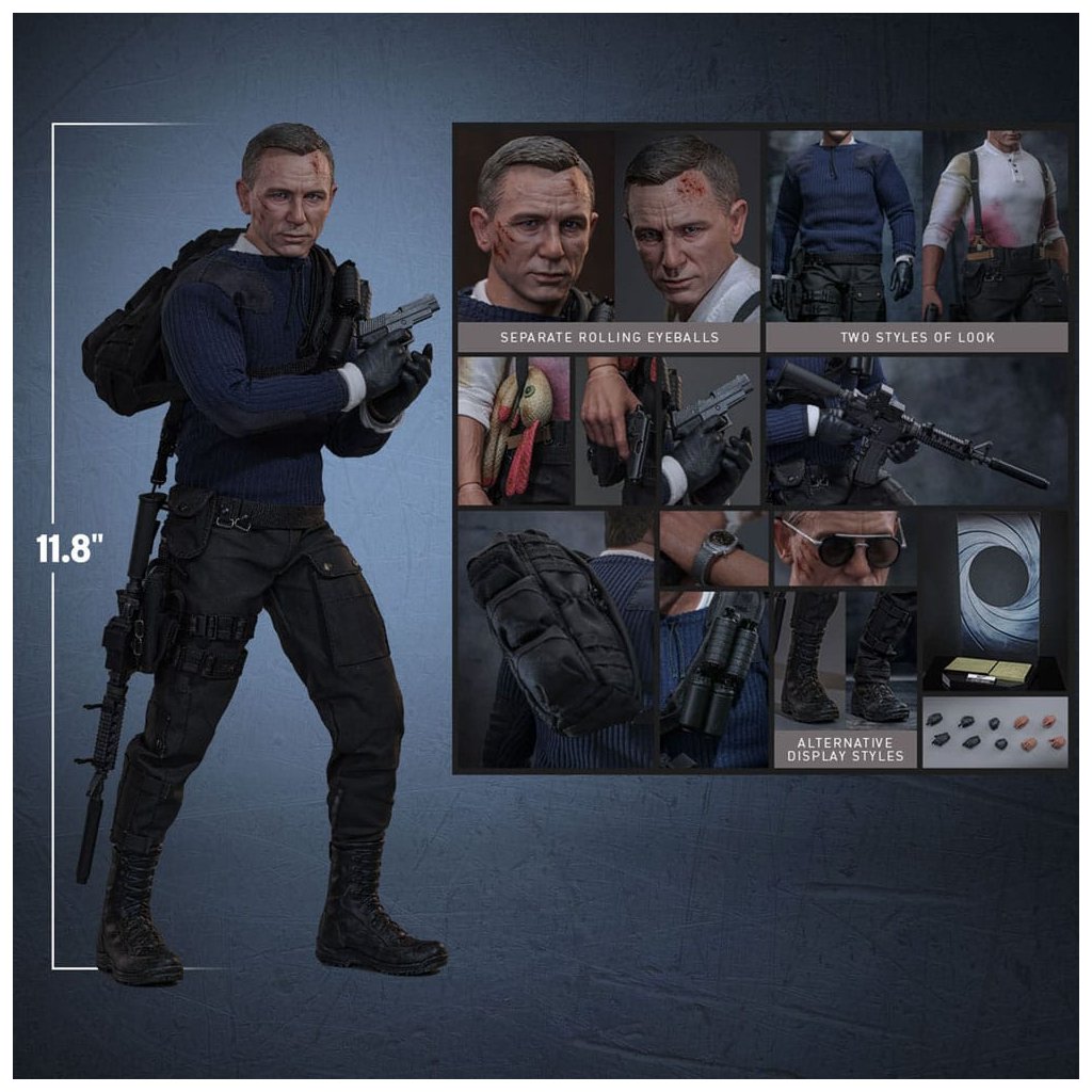 Tato 30cm figurka v měřítku 1/6 nabízí hyperrealistický portrét, detailní oblečení z látkových materiálů a bohaté příslušenství, díky kterému můžete vystavit Bonda v nezapomenutelných pózách z jeho finální mise.