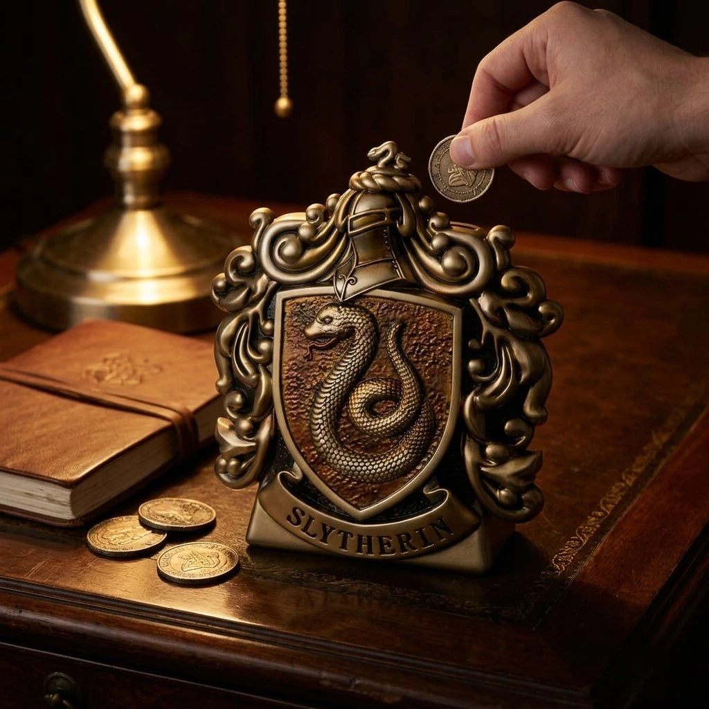 Ambicí, vynalézavostí a hrdostí se vyznačují ti, které Moudrý klobouk poslal do Zmijozelu. Nyní můžete své úspory svěřit pod ochranu samotného hada. Tato detailně zpracovaná pokladnička v podobě kolejního erbu není jen praktickým doplňkem, ale i majestátní dekorací pro každého fanouška světa J. K. Rowlingové.