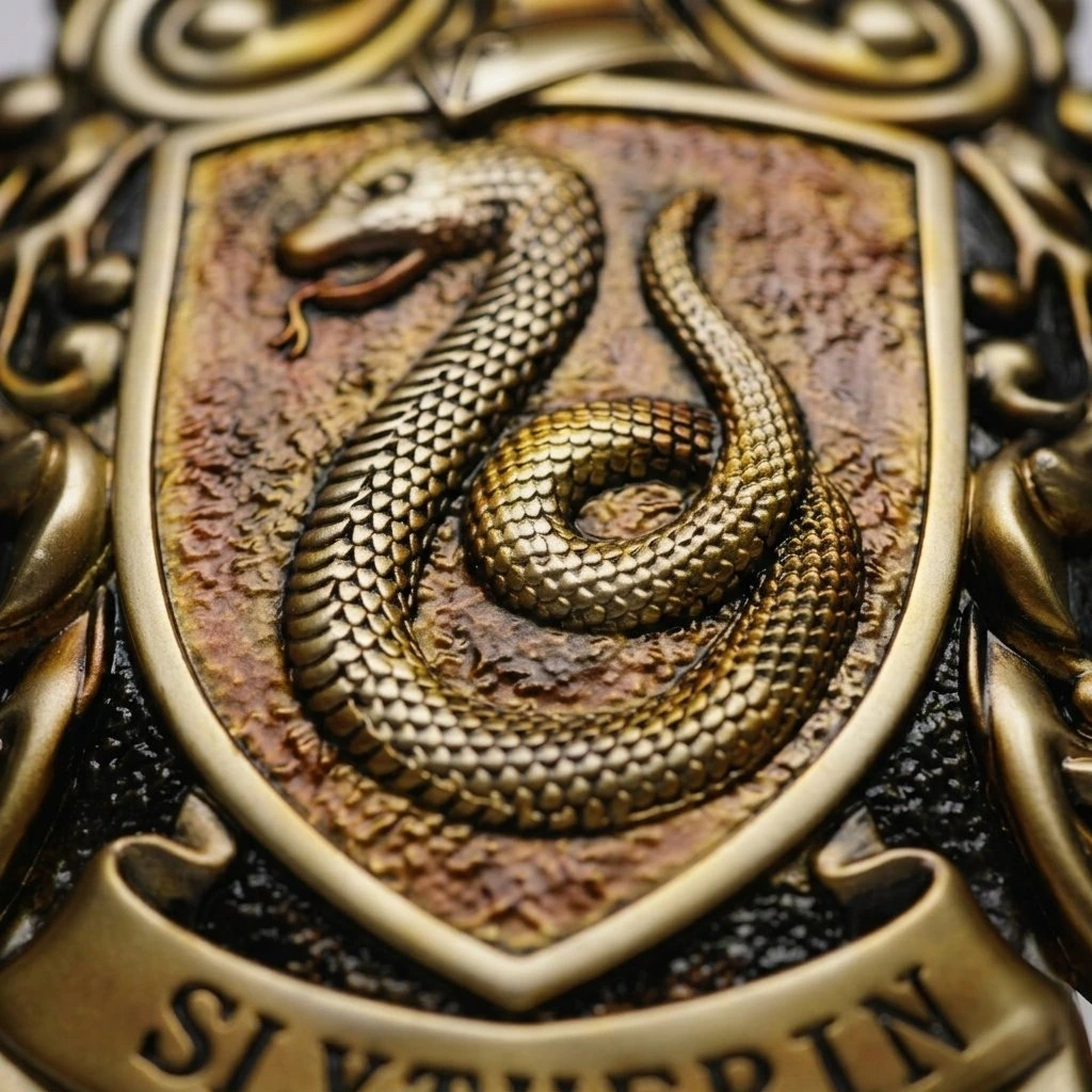 Design: Detailní 3D reliéf erbu Zmijozelu s ikonickým hadem.