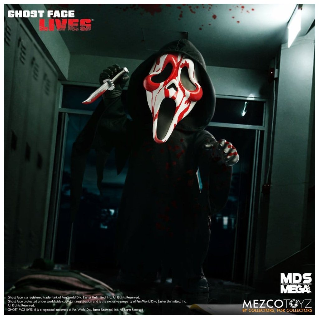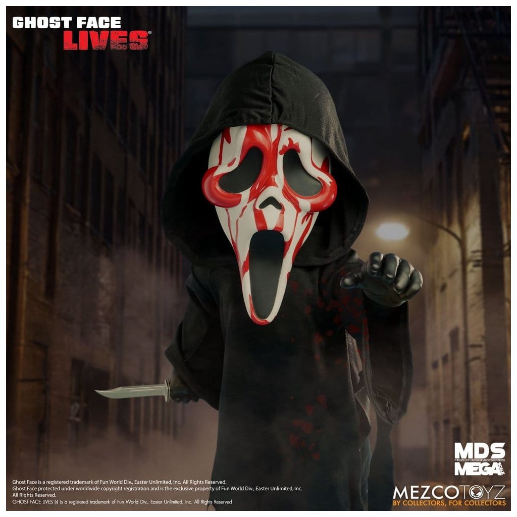 Ikonický vrah Ghost Face ze série Scream přichází v děsivě stylové krvavé edici jako MDS Mega Scale Roto Plush panenka o výšce 38 cm.