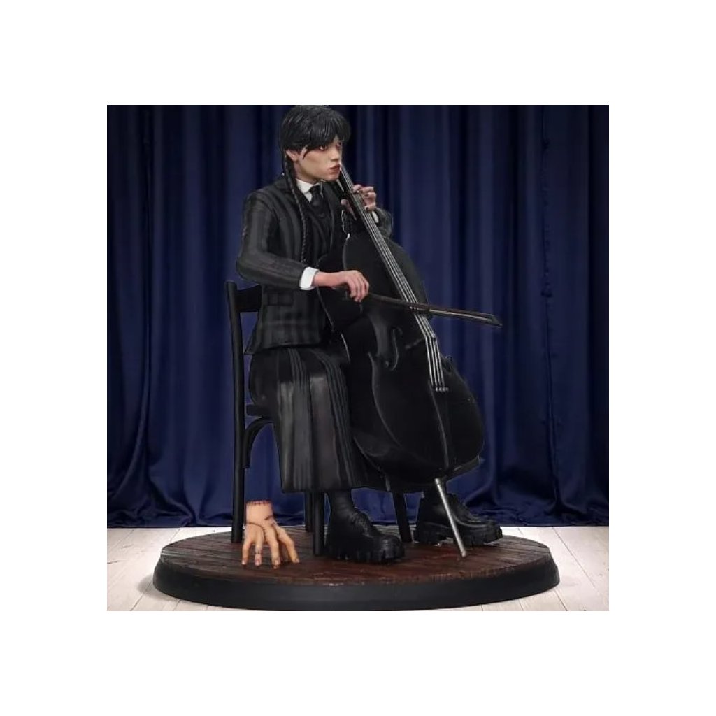 Nechte se okouzlit soškou Wednesday Addams inspirovanou populárním seriálem Tima Burtona, kde postavu ztvárnila Jenna Ortega. Figurka zachycuje ikonickou scénu, kdy Wednesday na svém balkoně hraje na violoncello skladbu Paint it Black, zatímco kolem ní vládne tajemná atmosféra.